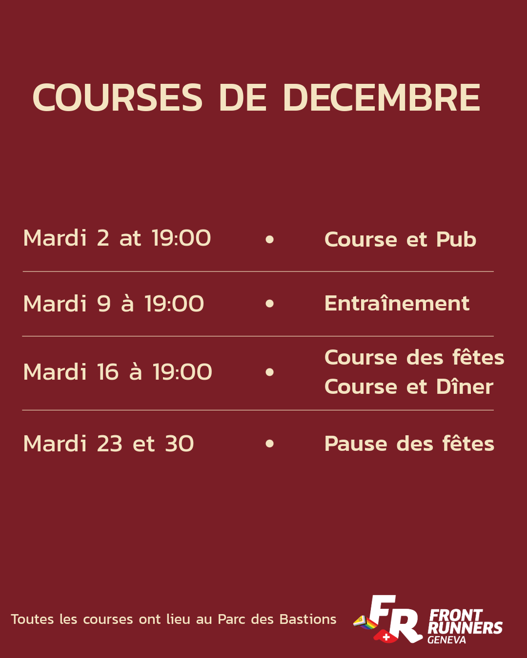 Nous nous retrouvons tous les mardis à 18h55 au Parc des Bastions, où nous nous rassemblons avant de partir courir 5 km dans la vieille ville ! Les coureur·euse·s de tous niveaux sont les bienvenu·e·s, que vous soyez novice complet·ète ou athlète expérimenté·e. Notre objectif est de créer un environnement sûr, inclusif et amusant pour tout le monde. Enfilez vos chaussures de course et rejoignez notre chouette communauté !